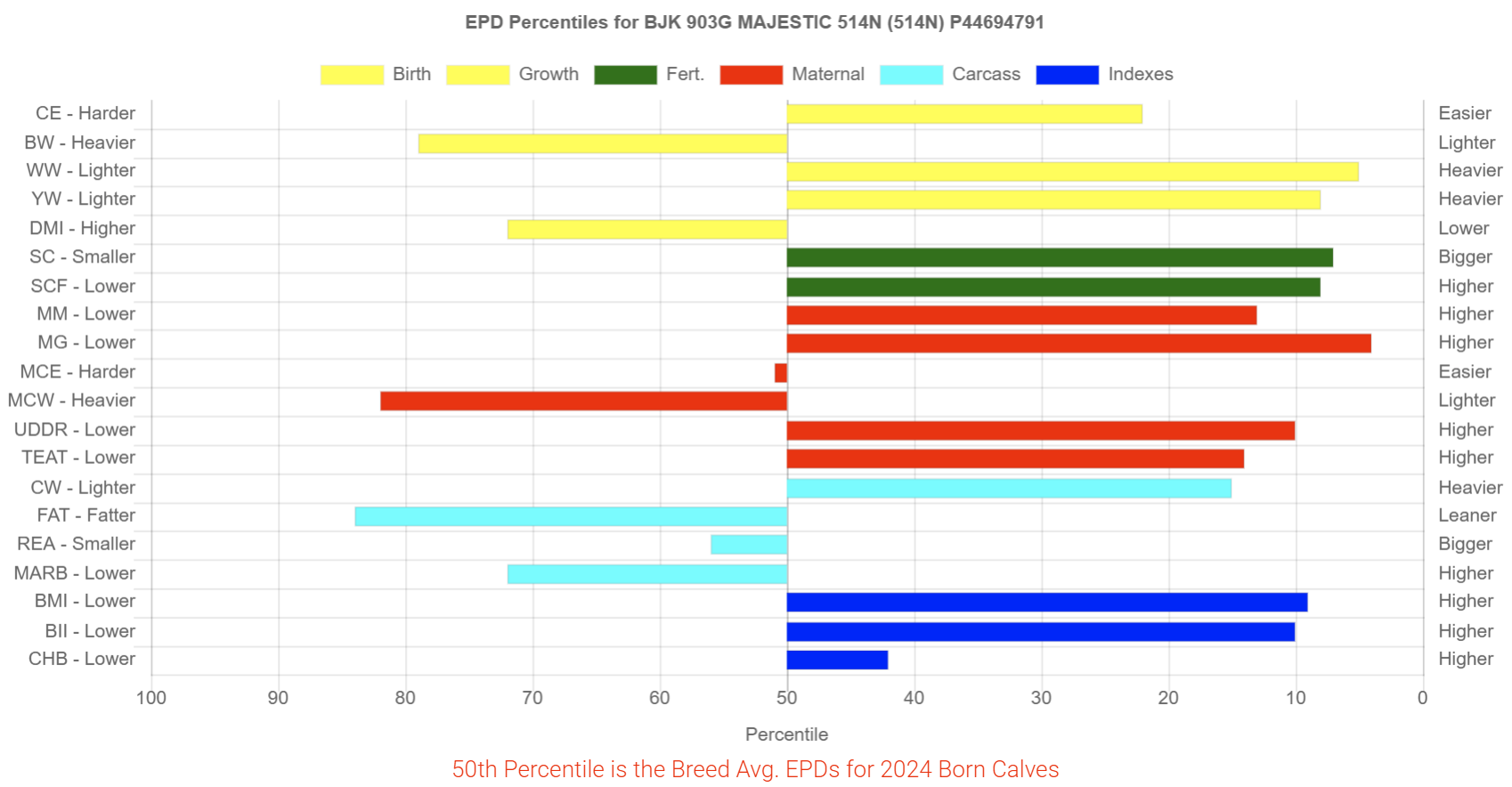 Majestic 514N offers a strong maternal profile and significant early growth. He is well-suited for producers looking to retain productive, high-milking daughters. He provides impressive spread with both top 5% Weaning Weight (WW) and top 8% Yearling Weight (YW). He maintains solid commercial utility with a top 10% Baldy Maternal Index (BMI), though his EPDs suggest he is better utilized for building a female base than as a terminal sire.