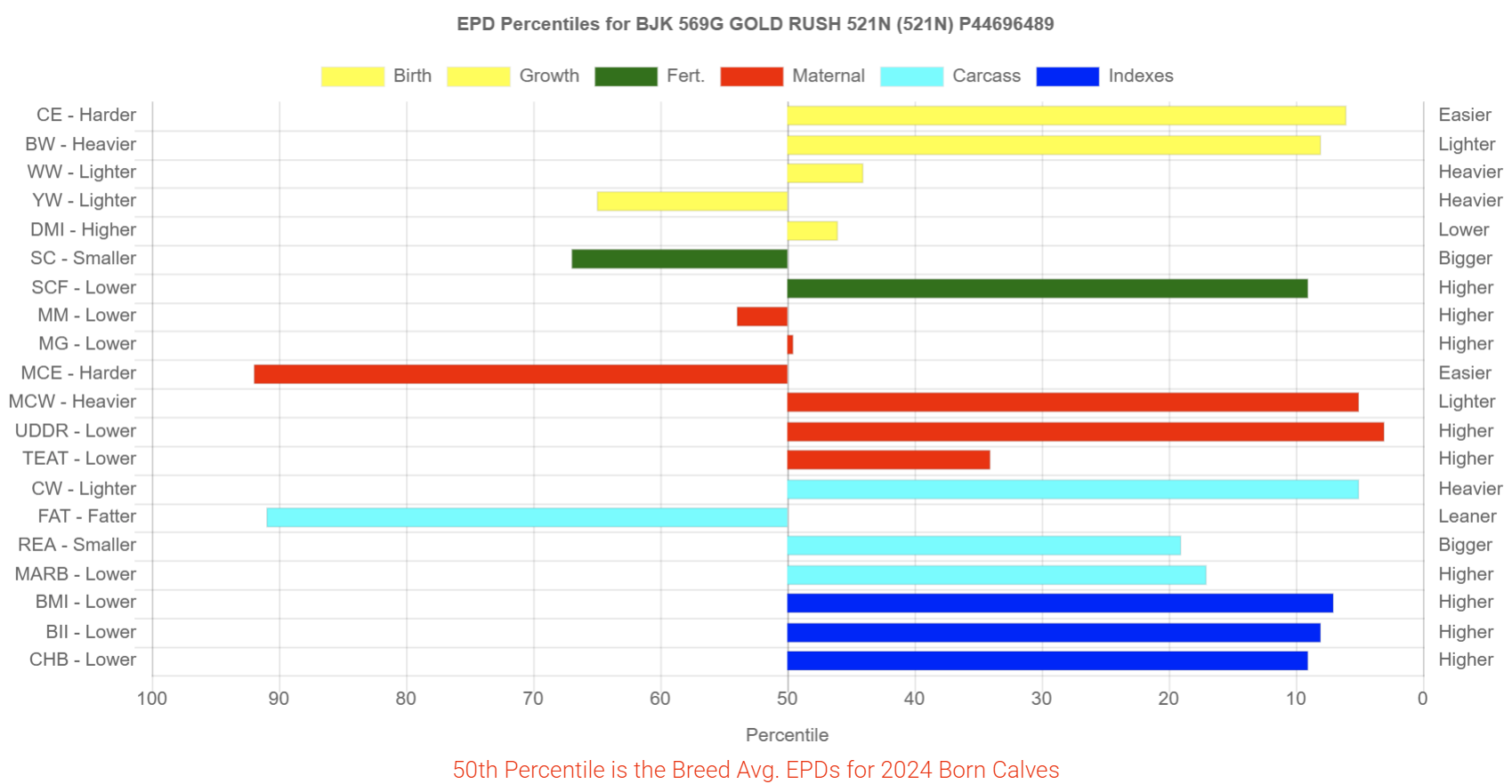 Gold Rush 521N is a calving-ease specialist that excels in both maternal efficiency and carcass weight. Ranking in the top 6% for Calving Ease (CE) and the top 8% for Birth Weight (BW), he is a reliable choice for heifers. His maternal profile is particularly strong, offering top 9% Sustained Cow Fertility (SCF) and a top 3% Udder (UDDR) score, all while maintaining a moderate mature cow size ranking in the top 5%. With top 10% strength across all three economic indexes, this sire offers sleep-all-night calving ease and high-impact profitability.